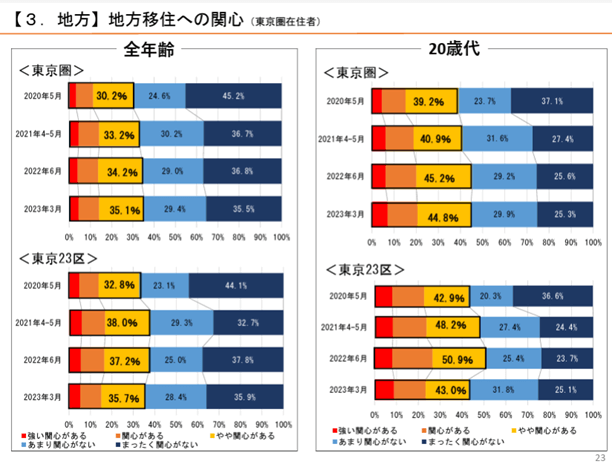 各自治体で転出超過が懸念される一方、リモートワークの普及や仕事と生活の調和を重視する「ワークライフバランス」の浸透により、都市部にこだわらず地方にも目を向けている現役世代が増えているのも事実です。2023年に行われた内閣府の調査によると、コロナ禍以降は全年齢で地方移住に関心がある人の割合が増えており、特に20代ではその傾向が強く現れていることが分かります。地方からの人口流出がある一方で、この関心がある世代にいかにアプローチするか?という点が非常に重要になってきます。