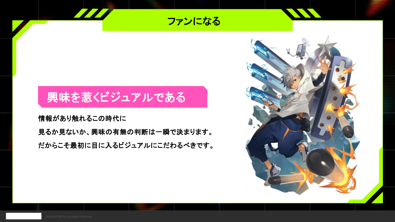 そのビジュアルに関しては「初出の描き下ろしを使用する」「拡散したくなる仕組みにする」などのポイントを具体的な事例を元に解説が行われました。