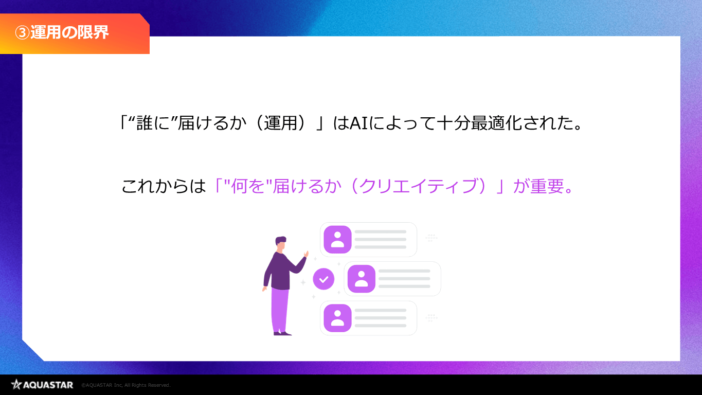誰に届けるか(運用)はAIで自動化・最適化されており、競合と差が出にくい。今後は何を届けるか(クリエイティブ)が重要になってくる。