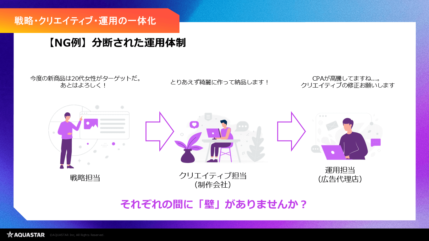 「戦略」・「クリエイティブ」・「運用」が異なる会社で担当する場合、一貫性が無くなるだけでなく連携が上手くいかなくなる可能性があります。本ウェビナーでは、3つの運用体制をワンチームで行う重要性を伝え、さらにはワンチームを実現できる事例の一つとして弊社アクアスターにおけるデジタルマーケティング・広告運用体制を取り上げました。