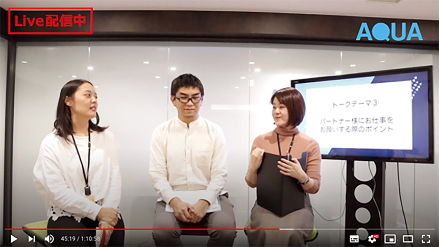 社内のイラストレーターとディレクターの普段の業務内容や、事前にアンケートで募集していたアクアへの質問に対して対談形式で回答しました。