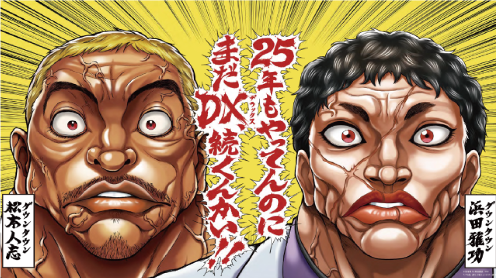 『刃牙』シリーズでおなじみの板垣恵介先生による監修、地獄のミサワ先生による独特な世界観のシュールなタッチでダウンタウンの二人を表現。